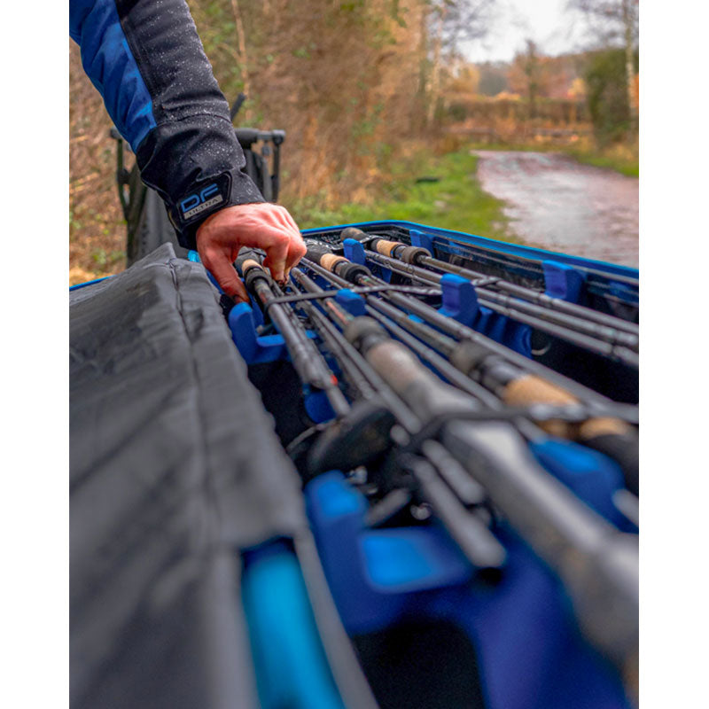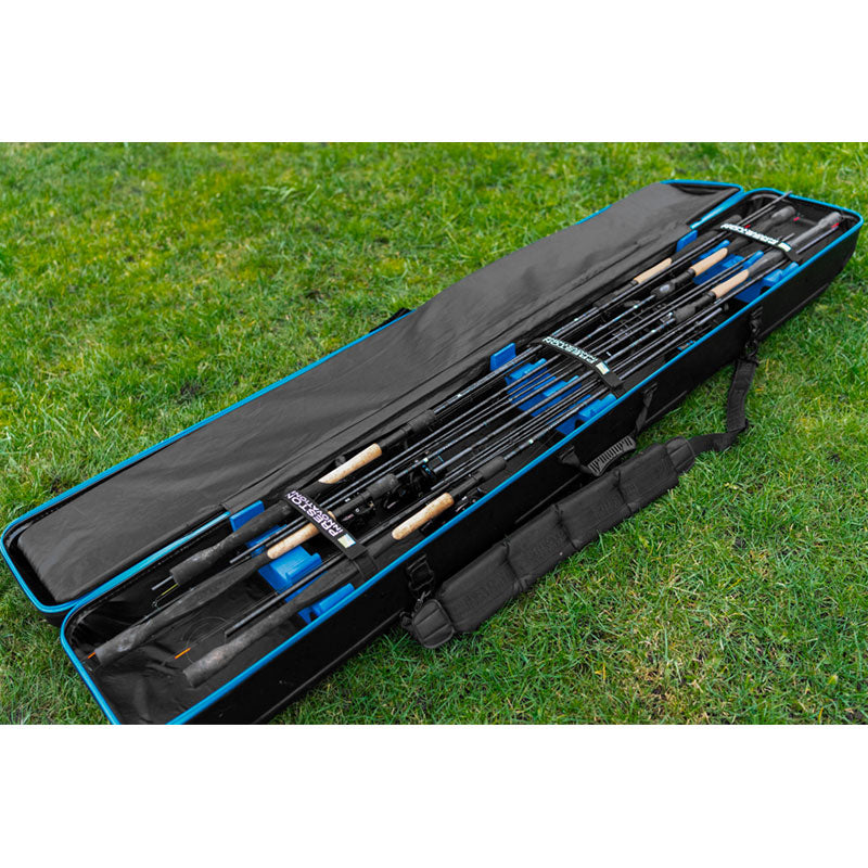 Progettata per tenere al sicuro canne e mulinelli assemblati durante il trasporto, questa custodia XL per canne da pesca può contenere facilmente fino a 6 canne di varie lunghezze. È dotata di divisori mobili e cinghie di fissaggio in velcro, oltre a un ampio scomparto che protegge i mulinelli da eventuali danni. Presenta inoltre robuste cerniere e una tracolla per un trasporto sicuro.
