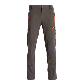 Pantalone in tessuto rip-stop elasticizzato verde/fluo arancio idrorepellente con protezioni in tessuto tecnico sulle ginocchia sul sedere e sul fondo gamba, 2 tasche frontali con zip 2 tasconi a taglio con zip 2 tasche dietro con zip.
