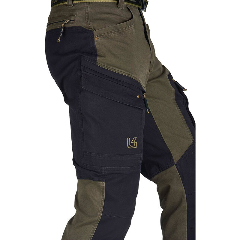 Pantalone da caccia SATURNIA, pratico e funzionale, in robusto canvas di cotone elasticizzato con trattamento stone washed. Due tasche frontali, doppie tasche laterali una a scomparsa con zip sui cui è applicata tasca a soffietto con pattina, due tasche posteriori con zip. Elastico ai fianchi e cintura removibile.